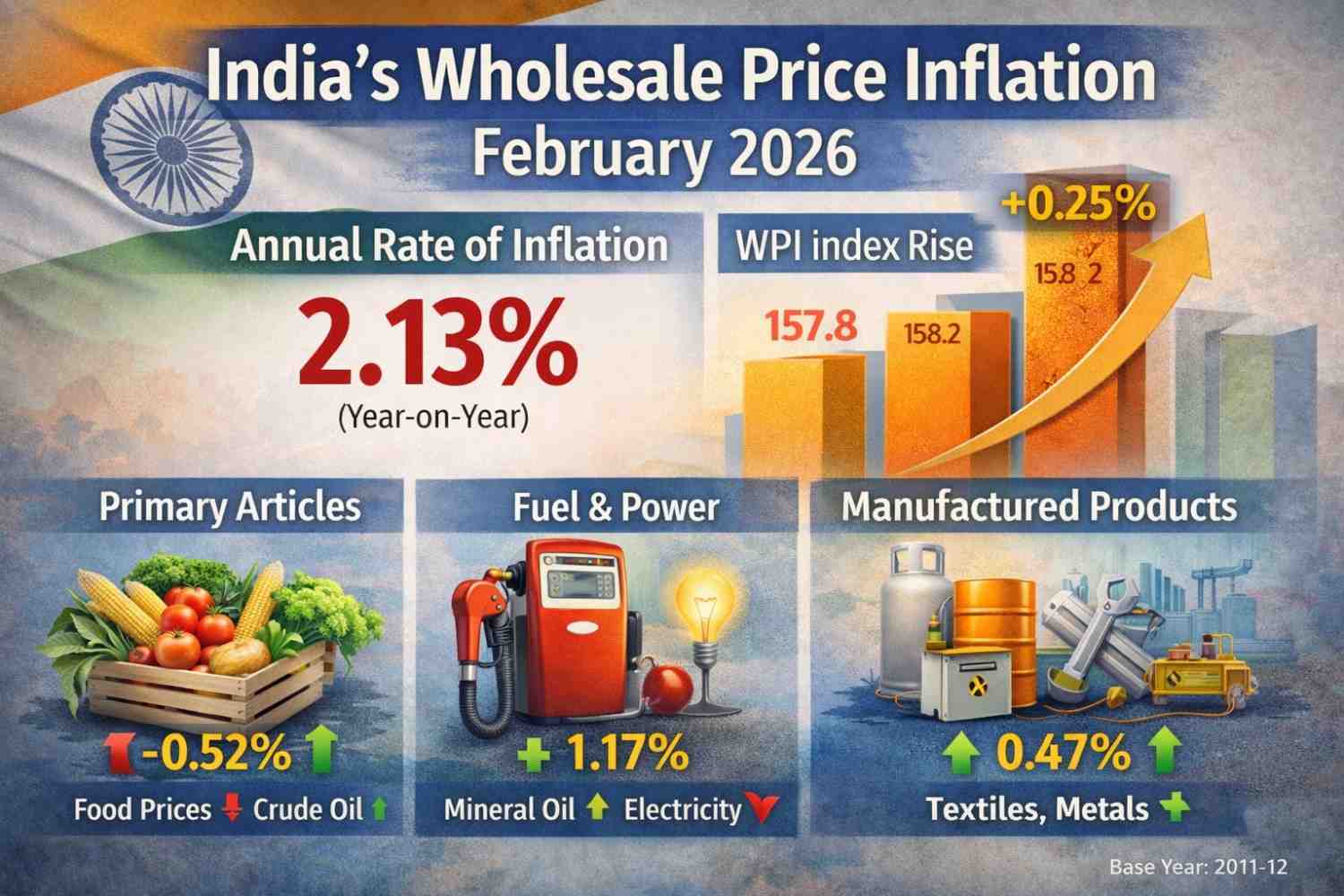 India’s wholesale price inflation rose to 2.13 percent in February 2026, according to the latest data released by the Department for Promotion of Industry and Internal Trade under the Ministry of Commerce and Industry. The inflation figure is based on the Wholesale Price Index (WPI) with the base year 2011–12 = 100.