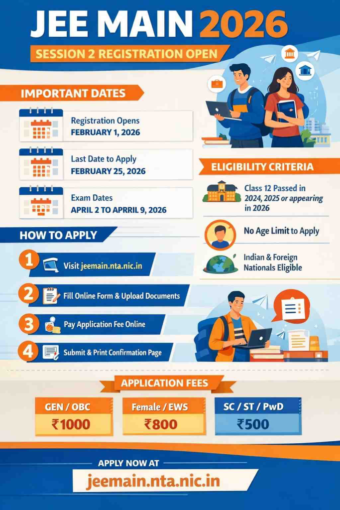 The National Testing Agency (NTA) has officially opened the registration window for JEE Main 2026 Session 2, giving engineering and architecture aspirants across the country another crucial opportunity to compete for seats in India’s premier technical institutions. The application process is being conducted entirely online through the official website jeemain.nta.nic.in, and candidates are advised to carefully review the rules and eligibility conditions before submitting their forms.