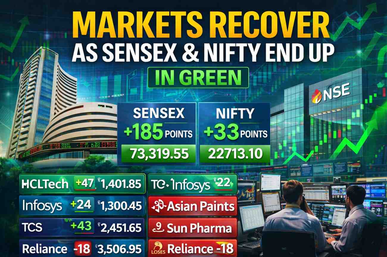 Indian equity markets ended on a positive note on April 2, 2026, after a volatile trading session. The BSE Sensex rose by 185.23 points to close at 73,319.55, while the Nifty 50 gained 33.70 points to settle at 22,713.10. The recovery was largely driven by gains in information technology (IT) stocks during the latter half of the session.